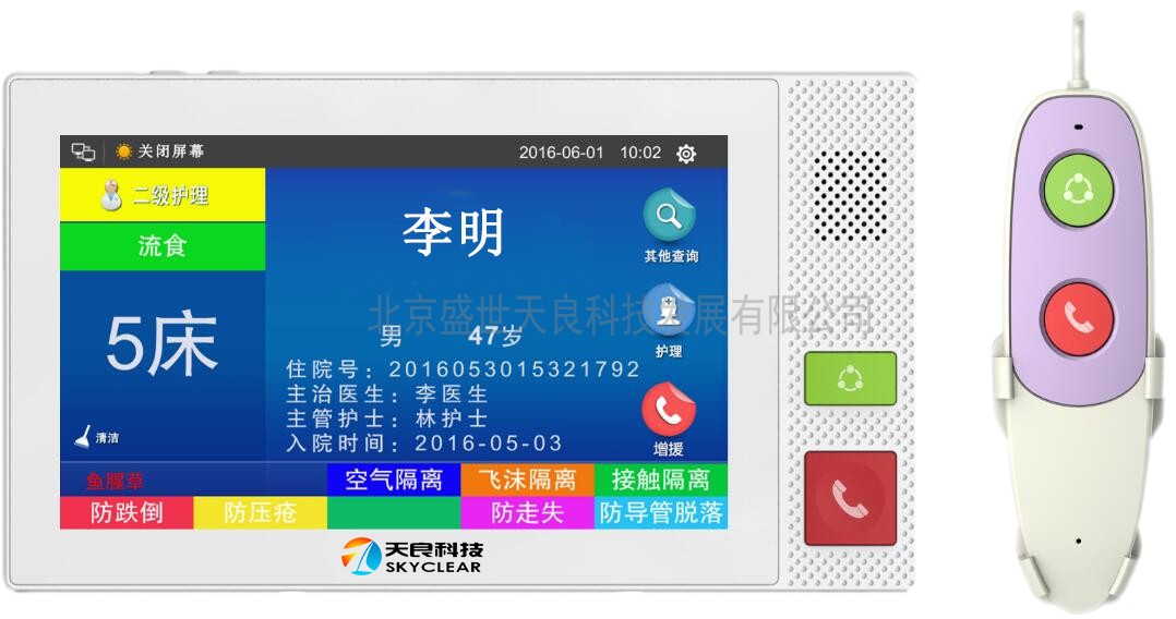1)采用7寸TFT(觸摸屏),超薄面板,含手持呼叫手柄,安裝在病床上方的設(shè)備帶上,每個(gè)病床一臺(tái),用于呼叫護(hù)士站,患者基本信息展示