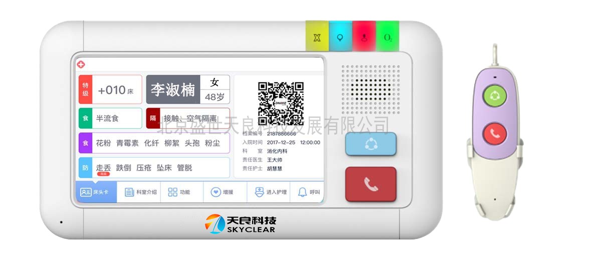 1)采用5寸TFT(觸摸屏),超薄面板,含手持呼叫手柄,安裝在病床上方的設(shè)備帶上,每個病床一臺,用于呼叫護士站,患者基本信息展示