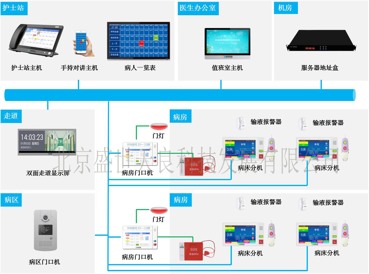 該系統(tǒng)主要由系統(tǒng)管理軟件、醫(yī)生主機(jī)、護(hù)士站主機(jī)、病床分機(jī)(含呼叫手柄)、病房門口機(jī)、緊急呼叫分機(jī)、病房門燈、病人一覽表、走廊屏顯示屏、病區(qū)門口機(jī)等組成(系統(tǒng)組成如下圖所示)