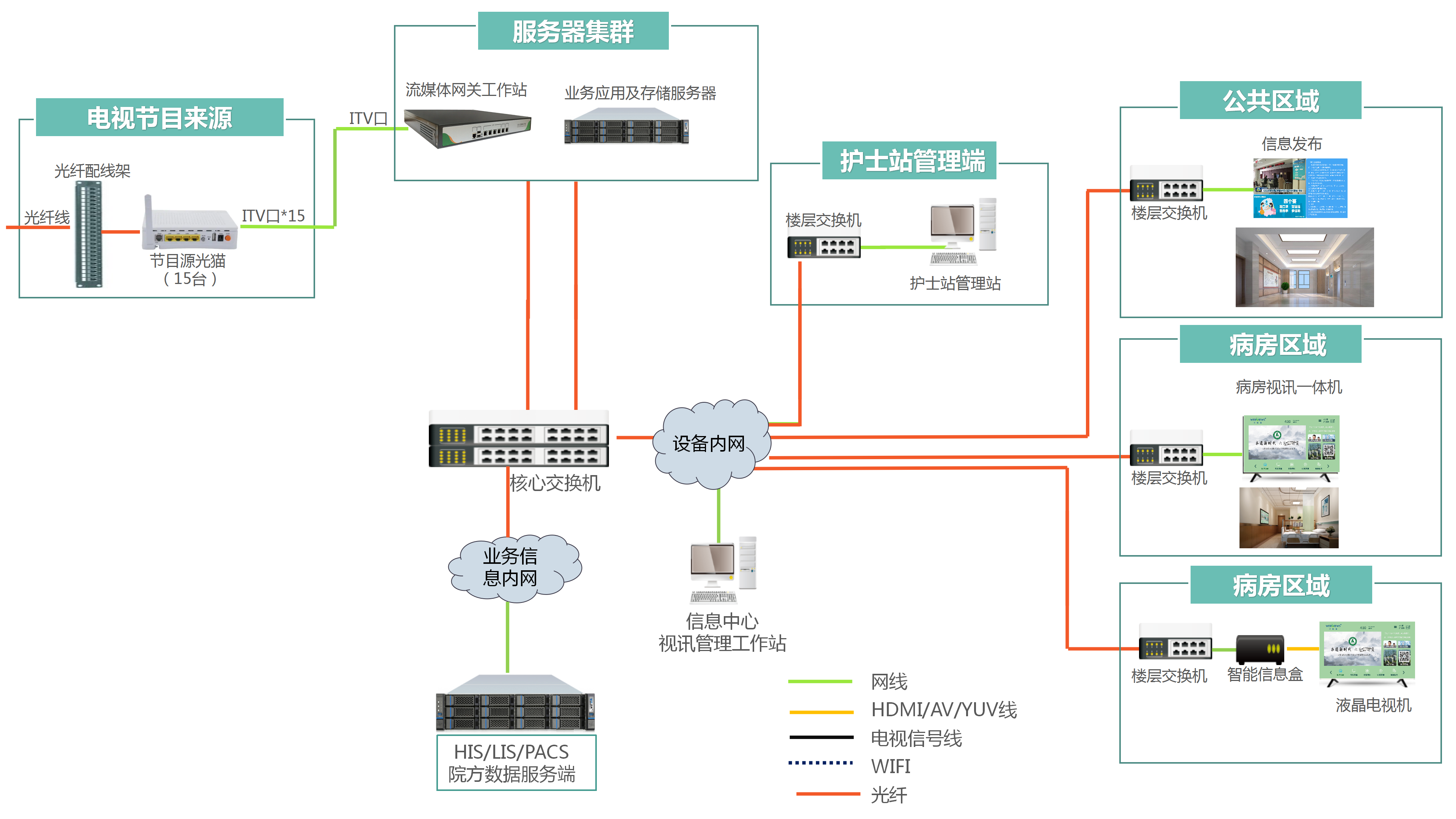 天良IPTV病房電視服務(wù)系統(tǒng)處在院內(nèi)設(shè)備網(wǎng),可獨立規(guī)劃網(wǎng)段也可以劃分其它核心交換網(wǎng)絡(luò),從機(jī)房核心交換機(jī)到各樓層匯集交換機(jī)可根據(jù)實際距離定義網(wǎng)線或者光纖傳輸,從樓層交換機(jī)到每臺播放終端采用六類或超五類網(wǎng)線傳輸接入。
