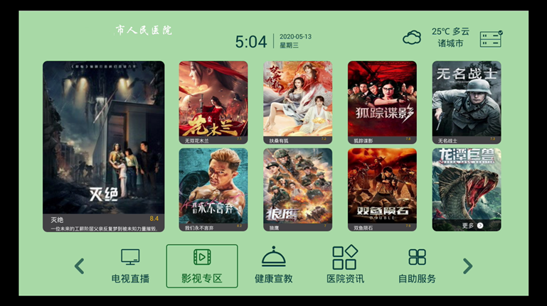 天良IPTV病房電視服務(wù)系統(tǒng)在病房區(qū)域主要可以根據(jù)實際情況靈活采用二種播放方式選擇性的實現(xiàn):病房32-55尺寸以上病房視訊一體機(jī)、病房終端高清終端盒子,該終端的接入端為網(wǎng)口,采用220V供電,該設(shè)備將來自網(wǎng)絡(luò)的IPTV電視節(jié)目流及各類數(shù)據(jù)流實時轉(zhuǎn)換為視音頻信號并輸出顯示到終端設(shè)備屏幕上,用戶可通過遙控器按照電視中的UI界面實現(xiàn)交互操作。