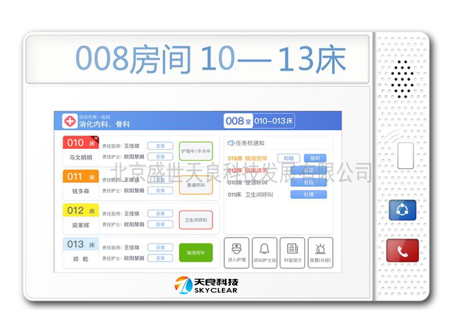 采用10寸觸摸顯示屏,ABS面板;嵌入式安裝在每個(gè)病房門口外的墻壁上; 一個(gè)病房配置一臺(tái),可外接防水按鈕。
