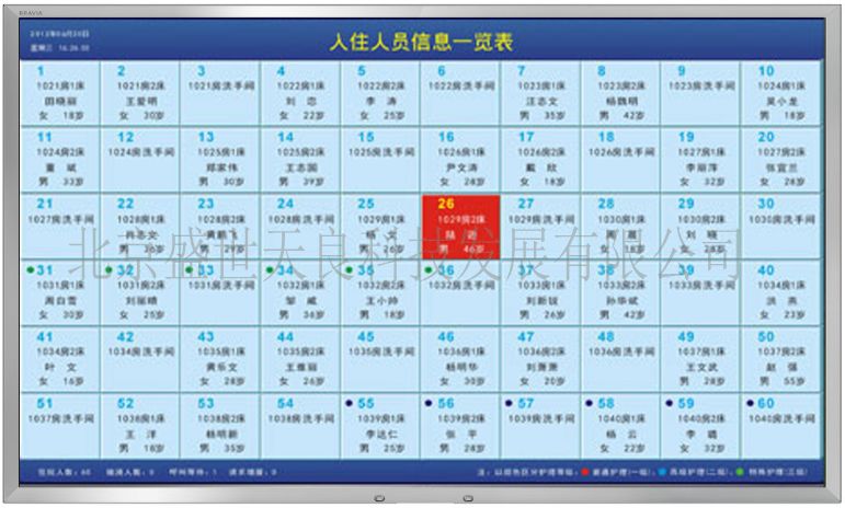 病員一覽表:可顯示每路病床分機(jī)的病人信息,并支持接入病員一覽表顯示。